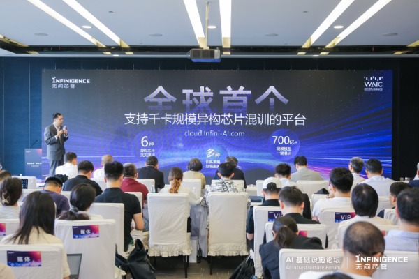同时,夏立雪宣布无问芯穹Infini-AI云平台已集成大模型异构千卡混训能力,是全球首个可进行单任务千卡规模异构芯片混合训练的平台,具备万卡扩展性,支持包括AMD、华为昇腾、天数智芯、沐曦、摩尔线程、NVIDIA六种异构芯片在内的大模型混合训练。7月起,通过试训申请的用户,已可在Infini-AI上一键发起700亿参数规模的大模型训练。