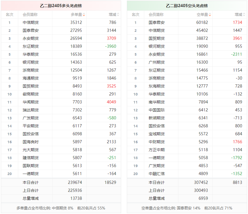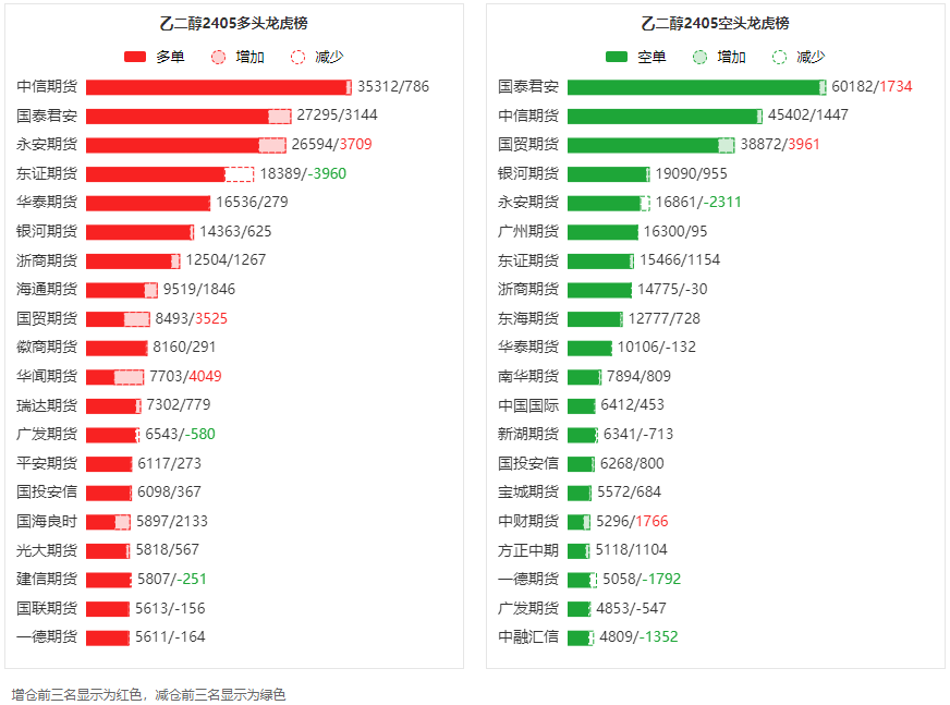总体而言,乙二醇2405合约今日增仓上行,多空持仓排名前20席中,多空双方均呈进场态势,多头进场意愿强于空头。